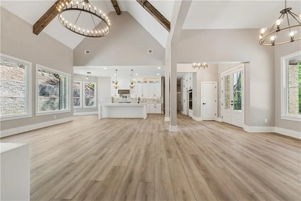 One of a kind - brand-new Custom-built with full 4 side masonry brick, oversized Ranch palace on Lake Lanier with four bedrooms, three full bathrooms and upscale upgrades! Beautiful 1.12-acre lot, located in an established Lake Lanier waterfront HOA community with swim/tennis with low priced dues! Walk into extremely high (2.5 story) ceilings, unique loft living space with custom hand built exposed beams and a home filled with natural light. Fantastic floor plan perfect for entertaining and easy living for all stages of life. Very wide hallways for convenient and easy excess! Custom cabinetry and oversized spectacular island, quartz counters, designer backsplash. See the oversized walk-in kitchen pantry (with its own window), opens through the kitchen hall door. Living room opens up to a landscaped backyard, with a second level terrace. Oversized Master ensuite complete with vaulted ceilings, bathrooms featuring his and hers vanities + 2 walk in closets, and a soaking tub. Oversized and very deep garage. The mud room/laundry has a big window and farm sink and stainless-steel appliances; the laundry has oversized space for cabinets and shelves. Bedrooms have generous double closets. Subdivision has an excess to the Lanier. Back your boat in at Bolding Mill Ramp 5 mins away. Great area and beautiful neighborhood! The house has extremely attractive curb appeal and a very private secluded back and side yards. Full builders warranty. Do you want to live safe and healthy on Lake Lanier, Georgia? Do you want to have a big 1 level home on a huge, private land lot next to water, not too far from Atlanta? Do not look any further.
